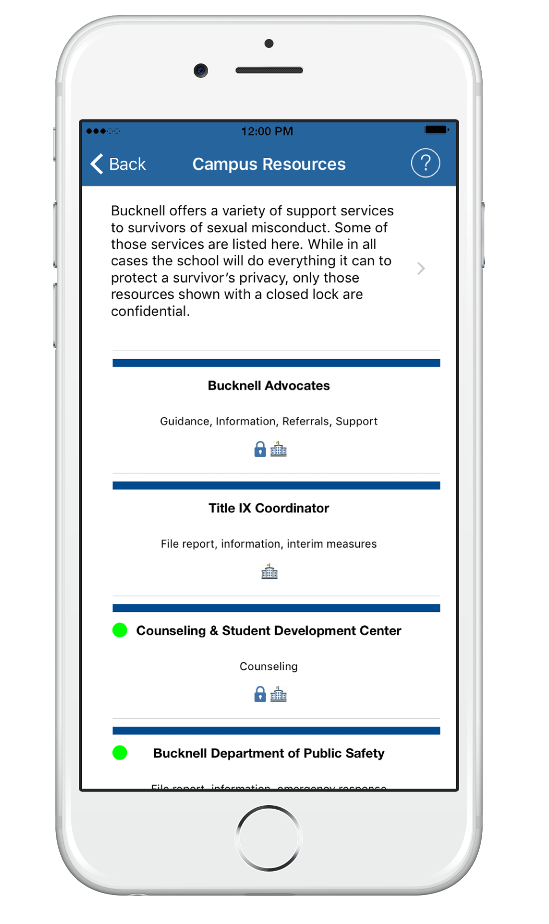 Resources are specific to Bucknell and the local community. Each resource includes a description, complete contact details, and hours.