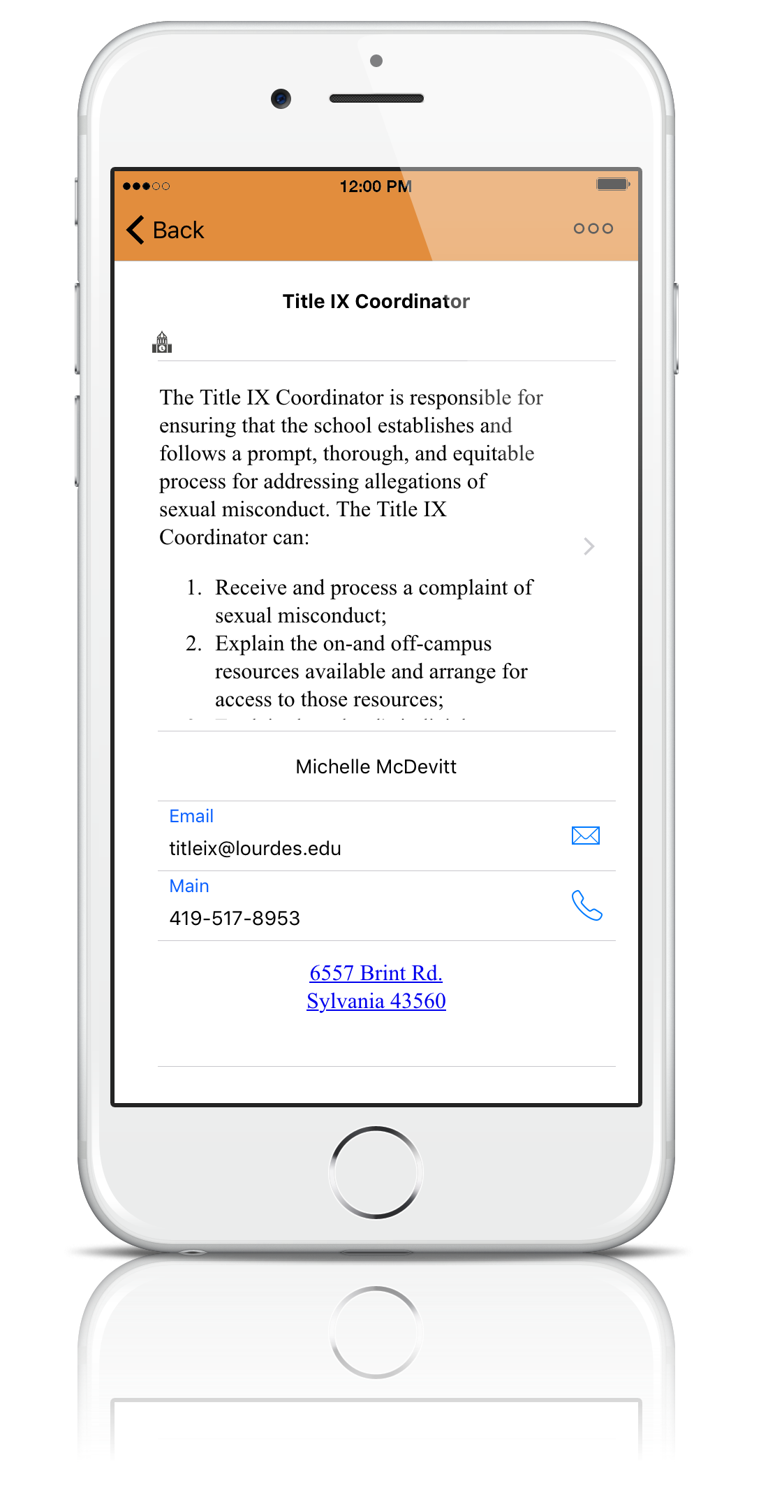Easily find digestible and relevant information from Lourdes's policies and procedures, as well as links to websites with helpful information related to sexual misconduct.